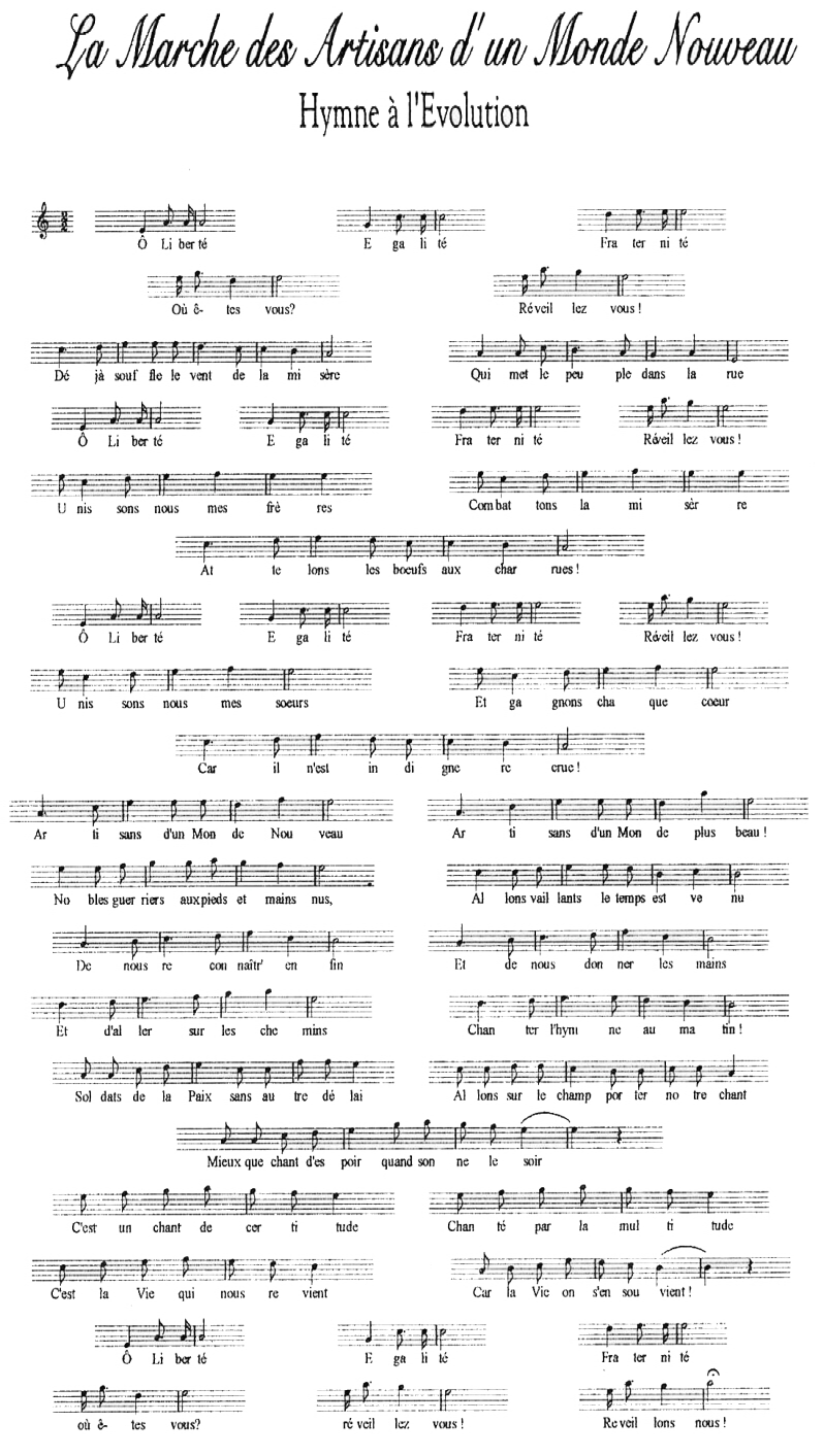 Nouveau Rappelons nous ou apprenons que le son est guérisseur, et que si nous nous accordons sur un son et sur un sens, alors nous pourrons atteindre l'harmonie, parce que la voix, à travers le choeur, ouvrira la voie du coeur qui donne sans compter Le projet "Mille voix pour un chant" consiste à réunir un minimum de mille voix pour enregistrer un CD à distribuer pour la promotion de La Marche des Artisans dun Monde Nouveau à travers le monde en général et la francophonie en particulier.Pour participer et soutenir ce projet, merci de vous inscrire sur cette page. |